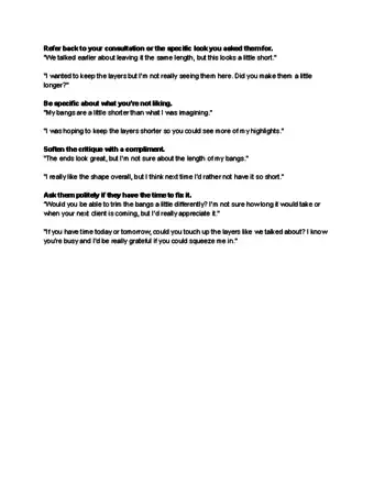 - Say, “I don’t think the stylist really understood what I wanted. I can explain how I want it to look if someone can fix it free of charge.” Try to be as specific as possible about what you want done differently.