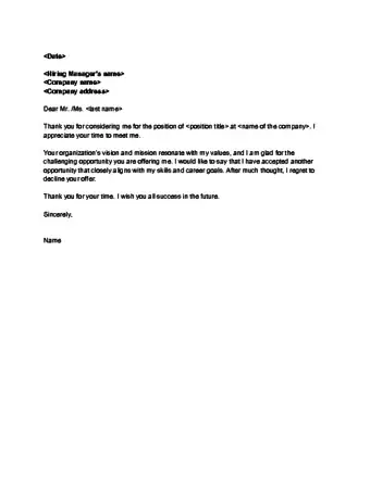 4State your reasons for declining the offer. You can just say the position didn't suit your needs, or that you found another position that aligns more with your objectives.[7]