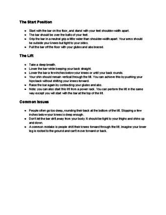 • Going outside your range of motion can also be dangerous. When you feel your hamstrings stretching, stop lowering the bar. You do not need to bring it all the way down to the floor.
