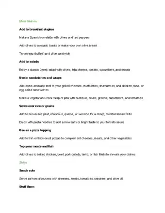 - Olives add a nice, salty flavor to salads, sandwiches, and other foods.