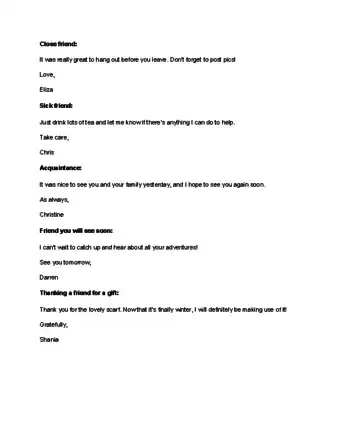 A great way to conclude your letter is to note any details you'd like them to remember or share a positive tidbit about something good that happened to you that you think your friend might be interested in. Have fun, and imagine that you're talking to your friend in person. What would you want to say to them before they leave?
