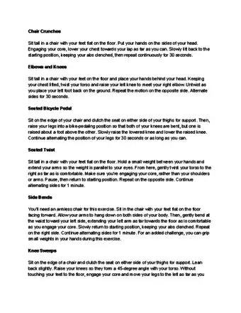 1Do modified ab crunches. Sit leaning slightly backwards in a reclining bench or chair with your knees together and bent at a 90-degree angle. Interlace your fingers behind your head and tighten your abs. Lean slightly back so that you just graze the chair back. Making sure your core is engaged, hinge your chest forward. Return to starting position. Perform 20 reps. [1]