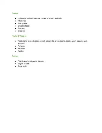 • Try the BRAT diet, containing bland foods like bananas, rice, applesauce, and toast. Other good options are crackers, noodles, and mashed potatoes.