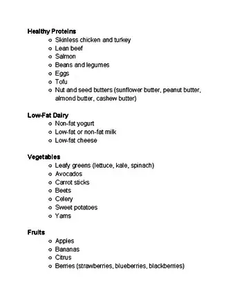 - Snack Ideas: veggies and fruit; natural yogurt and berries; a handful of nuts; veggies (like carrots, beans, snow peas) and low-fat dip. Do not buy yogurt-coated or chocolate-coated raisins or nuts. Most of these are full of added sugar.[5]