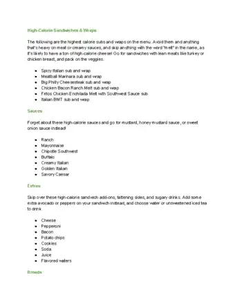 Skip other high-calorie additions. Ordering sweetened drinks, cookies, or chips can quickly derail your diet. Choose a low- or no-calorie beverage (such as unsweetened tea or water with lemon). If your sandwich is not quite enough food, have a piece of whole, fresh fruit as a snack.