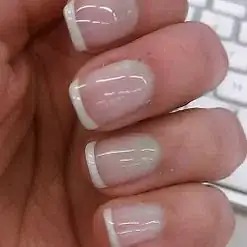 Take a sheer nude or sheer very light pink polish and apply one or two coats of it depending on how sheer the polish is. The point of this to not to color the nail, but to tint the white to make the fake nail look real.