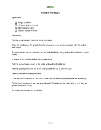 To make hash browns, you'll need 4 medium Russet potatoes, 2 tablespoons of butter, 1 teaspoon of salt, and ¼ teaspoon of pepper. After you peel the potatoes, shred them into a towel-lined bowl using a cheese grater. Next heat a skillet over medium-high heat, melt your butter in it, and add the potatoes. Cover the potatoes in butter, season with salt and pepper, and flatten the mixture with a spatula. Cook until both sides are golden brown, remove from the heat, and enjoy. If you want to learn how to use cooked potatoes to make your hash browns, keep reading the article!
