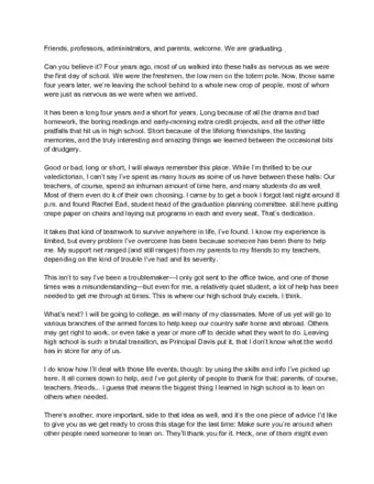 - If you're giving a high school commencement speech, remember that not everyone in your class will be attending college. Don't joke about your education letting you avoid a "bad" profession; chances are good there's a parent who has that job out in the audience.=