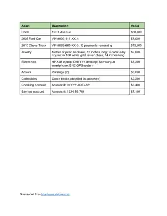 6Provide evidence of ownership. In addition to the list, you need to give evidence of intangible assets such as deeds, titles, certificates, insurance policies, and financial accounts.[6] These should be identified with account numbers and owner details such as name, address, and Social Security numbers. You should also include the names of any persons that have legal authority to manage, sell, or otherwise dispose of each financial asset.