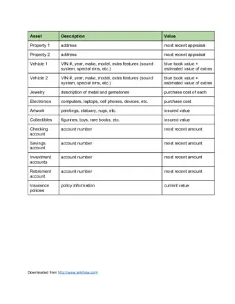 Making a list of personal assets is a good way to keep track of everything you own. Use an electronic spreadsheet, like Microsoft Excel to organize your list. In the spreadsheet, make 2 lists, one for physical assets, like houses and cars, and 1 for intangible assets, like deeds and titles. After listing each item, write out a short description of it including its condition and value, which will be useful if you ever decide to sell them. Don’t forget to include smaller items like clothing, jewelry, and tech equipment on your list. To see a sample personal assets template, scroll down!