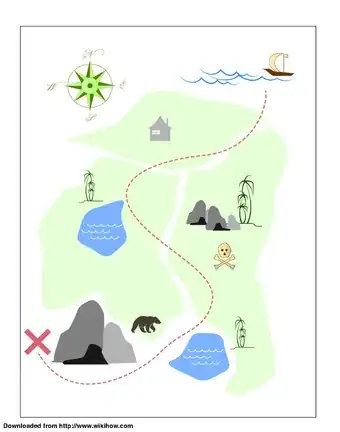 To make a treasure map, sketch your map out on a piece of plain white paper. Add features like a compass rose, landmarks, a path to get to the treasure, and of course an X to mark the spot where the treasure is buried. Once you’re satisfied with your design, go over it in ink. You might use black ink for most of the features on the map and red for things like the X. If you want to make your map look old, tear off the edges of the paper to give it a worn look. Wipe both sides of the paper with a wet teabag to make it look brown and stained. Crumple the paper, then unfold it and brush it with a little cooking oil. Blot the excess oil away and let the map dry. This should age your map a bit more and leave it feeling slightly stiff and crunchy. To learn more, including how to use your treasure map for fun activities like scavenger hunts, read on.