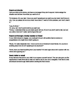 4Contact your child. While you may want to meet with them in person right away, it may feel less intrusive to your son or daughter if you reach out via phone call, email, or letter. Honor their need for distance and give them the opportunity to respond at the time of their choosing. Be patient and allow a few days for your child’s response.