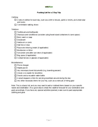To pack for a 2-day trip, you’ll want to make sure you have all your essentials without overpacking. Pick a smaller piece of luggage, such as a backpack, duffel bag, or a small suitcase. Check the weather of your destination before packing so you only bring the clothes you need. You should also make a list of the activities you’re doing to better plan. For instance, if you’re going sightseeing one day and a party the next, you’ll probably just need 1 casual outfit, 1 dressier outfit, 2 pairs of shoes, underwear, pajamas, and socks. Besides clothes, you’ll want to bring travel-size containers of toiletries, like toothpaste, deodorant, and soap. Or, if you’re staying somewhere where toiletries will be provided, consider leaving these items at home to save space. If you wear makeup, only bring what you really need and plan to use. To learn how to maximize the space of your purse or laptop bag, read on!