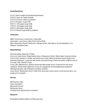 - Goals/Deadlines: Even if you don't have a publisher or editor breathing down your neck, it's a good idea to create personal goals and deadlines for completion. Create a master list for your folder and update both calendars if anything changes. For example, if you have an interview with a veterinarian, place that on the calendars and review your master list as to how that alters your goals.