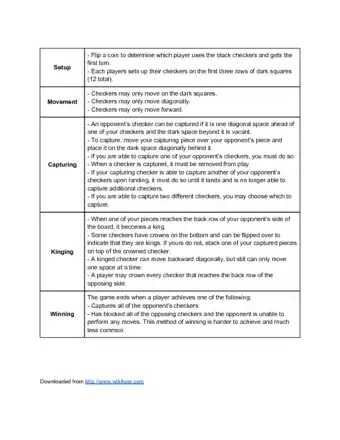 Checkers is a 2-player game that's played on a special board called a checkerboard. The goal of the game is to capture each of your opponents pieces, called “men,” or to make it impossible for them to move a piece. To play, first each player sets up their 12 pieces in the 3 rows at the bottom of their side. Each row should have 4 pieces, and each piece should be placed on a dark square. Then, players take alternating turns moving pieces forward diagonally on the dark squares. Pieces cannot be moved on to the white squares, and a piece may not move backwards. As players move their pieces, they want to capture their opponent's pieces by jumping over them diagonally on the board. In order to jump a piece, the dark square on the opposite diagonal side of the piece must be unoccupied. Once a piece has been jumped, it is removed from the game. If another jump is available after a piece has been removed, the player that captured the first piece must jump the next available piece. If a player moves their piece all the way to the opposite side of the board, that piece becomes a king. Place another piece of the same color on top of it to signify that it is a king. Kings can move forwards or backwards, but must stay on the same color as the rest of the pieces. The game is over when a player wins by removing all of their opponent’s pieces or making it impossible for their opponent to legally move a piece. If you want to learn more, like how to block your opponent's moves, keep reading!