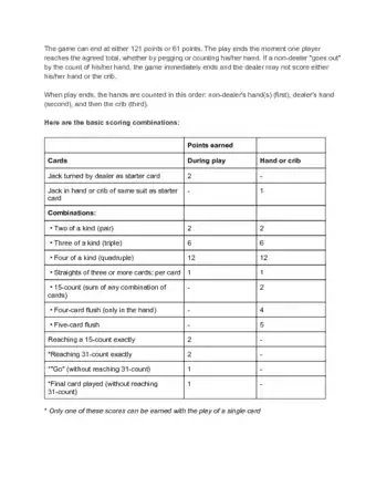 - Score points by having cards that total 15, making pairs or flushes, and creating runs of sequential cards. Move your pegs around the board to track your score.
