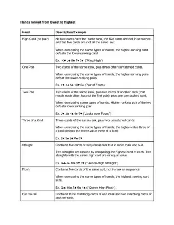 Tip: Keep in mind that if two people face off with the same type of hand, the hand with the higher-ranking cards wins. If the hands have the exact same ranks of cards (suit does not matter), it is a tie and the prize, if any, is split evenly.