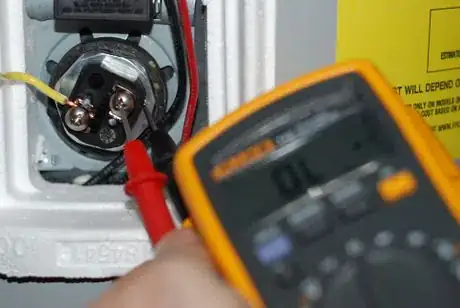 16Press the probe tips against the terminals of the heating element (one probe to each screw). Read the meter display. Look for a range multiplier (a "K" or "M" in the display) to be sure the value displayed is really ohms, not kilo ohms (K) or meg ohms (M).