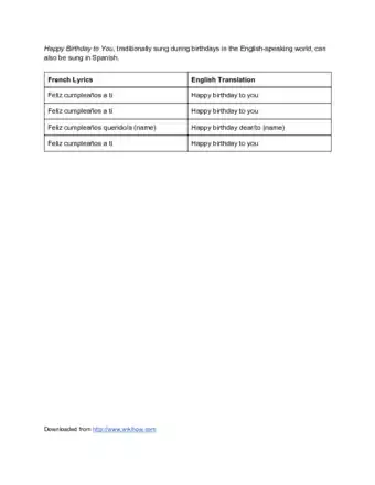 4Sing the "Happy Birthday" song in Spanish. The basic Spanish birthday song uses the same tune as the song in English, which you may already be familiar with. However, the Spanish lyrics don't necessarily translate directly to the lyrics in English.[6]