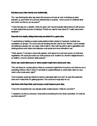 2Practice explaining your idea ahead of time. If you expect others to listen, you need to be able to explain yourself well. Before you bring your idea to others, make sure you are able to describe it accurately in a couple of sentences. Sometimes, that's harder than you think, and doing poorly can make a good idea sink before it gets a chance to float.[2]