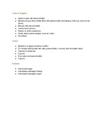 Community AnswerNuts are a great snack if you can eat them. They're full of healthy oils and protein. Plus, a small handful is usually a serving size! Quick and easy. If you can't eat nuts, try dried fruit, small crackers or some celery sticks.