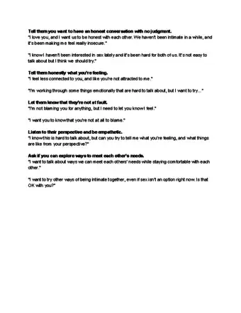 - If you have a lower sexual drive, try explaining, “I know I haven’t been interested in sex, and I don’t want you to feel like you’re to blame.” Talk about any physical or emotional obstacles you’re dealing with and say, “Even if sex isn’t an option right now, we can still find other ways to be intimate with each other.”