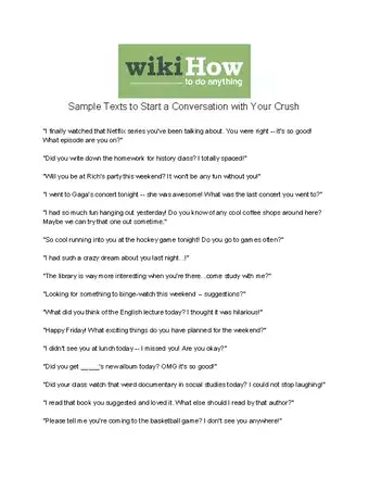 If you want to get to know your crush better, sending a text message is a great way to get the conversation started. Texting is a casual, low-key way to talk to someone you like without all of the anxiety of a phone call. But what should you say to start the conversation? Take a deep breath, summon your courage, and use this wikiHow guide to write the perfect conversation-starting text message that will make your crush want to keep talking to you!