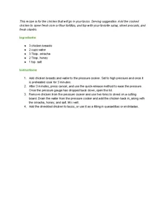 Place the food to be cooked inside the pressure cooker. Add the amount of water needed to properly cook the specific food you are making in the pressure cooker.’