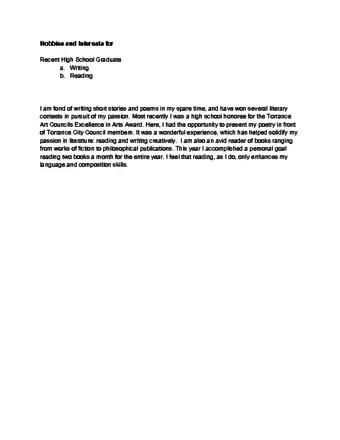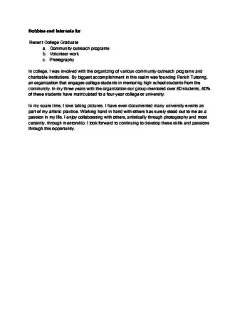 The interests and hobbies section of a resume or college application provides a good opportunity to showcase your personality. A well-executed one can even compensate for a lack in experience or education. Although you might think that all resumes are alike, you should always gear your document toward the specific audience who will be reading it, taking into consideration what they want from you as an applicant. This article will discuss how to write about your hobbies and interests for the two audiences for a resume: a college admissions committee and a potential employer.