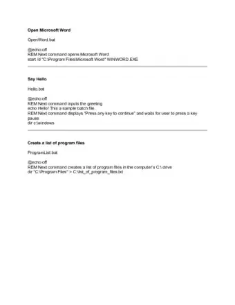 6Display some text. If you want to know what is happening in your batch file but don't want to see all the commands, you could program the batch file to print some text that explains what the batch file does. You can print text with ECHO. For example: