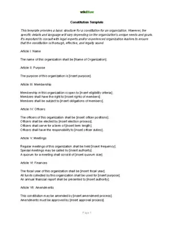 A constitution is a document that provides the rules on how an organization of people (e.g., a small club, a university group, or even a group as large as a country or state) runs its affairs. For most people, the need to write a constitution will likely arise in the context of a small organization. If you are writing a constitution for a student organization, your university may have a sample constitution on which you can model your own. You may also be making one for a micronation