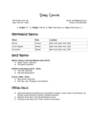 - Write a "Special Skills" section. Tailor this section to the particular job. For example, you may be applying to a theater piece that is looking for dancers who have experience in stage fighting or martial arts. Or you may be a strong acrobat and the production can benefit from this. If you don't know much about the production, include all of your dance-related special skills.
