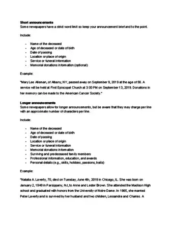 1Announce your loved one's passing. As with a basic notice, you should begin with the person’s name and the date they died. Include the age if you want.