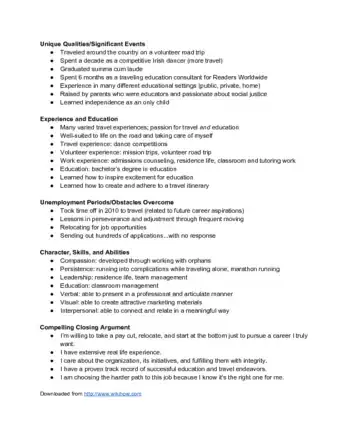 - What makes you a good candidate for a particular position? This is your chance to brag. Bring up past work experience and any awards or honors you've received. Talk about your publications, if you have them.