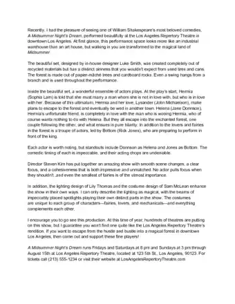 - Paragraph 1: Your introductory paragraph should describe what you saw on stage. You should also give context for the play, such as the playwright or composer of the play and where the play is being staged.