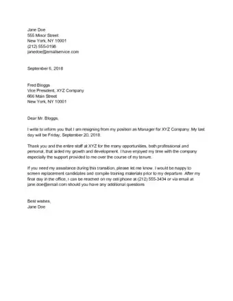 • Bad example: "I would like to quit from my position as [job title]. Please let me know what time frame would be most convenient for you."