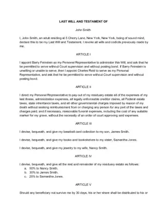 • For example, you may write: “To Tara Smith, I give my house at 123 Cherry Lane, and to Bob Jones, I give 50% of the remainder.”