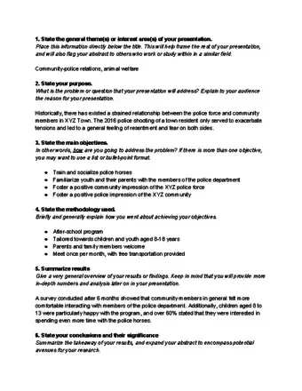 1Keep it in order. There are specific questions your abstract must provide answers for, but the answers must be kept in order as well. Ideally, it should mimic the overall format of your essay, with a general ‘introduction, ‘body,’ and ‘conclusion.’