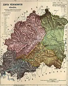 Árva County (Hungarian: Árva vármegye, Latin: Comitatus Arvensis, Slovak: Oravská stolica/župa,[1] German: Komitat Arwa, Polish: Komitat Orawa) was an administrative county (comitatus) of the Kingdom of Hungary since the 14th century until 1920. Its territory is now in northern Slovakia and southern Poland. Today, the Slovak name is only used as an informal designation of the corresponding territory (see Orava region).
