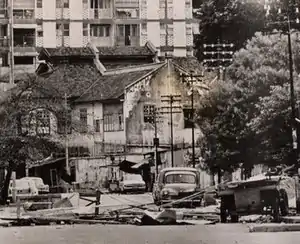 According to John Slimming, who wrote an account of the riot in 1969, the Chinese were taken by surprise and did not retaliate for more than an hour.[23] The NOC official report, however, suggested that Chinese secret society elements had prepared for trouble and were in action when the violence started in Kampung Baru.[24] In Batu Road, Chinese and Indian shopkeepers began to form themselves into an improvised defence force, while a Malay mob attempting to storm the Chow Kit Road area were met with armed secret society gang members and ran.[25] The Chinese attacked Malays who were found in Chinese areas, and Malay patrons in cinemas were singled out and killed.[25] They also attempted to burn down the UMNO headquarters on Batu Road and besieged Salak South Police Station.[23][26]