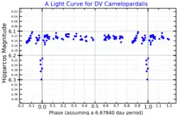 15 Camelopardalis is a triple star[5] system in the northern circumpolar constellation of Camelopardalis. It has the variable star designation DV Camelopardalis; 15 Camelopardalis is the Flamsteed designation. This is just visible to the naked eye as a dim, blue-white hued star with a baseline apparent visual magnitude of 6.13.[3] It is a probable (99%) member of the Cas-Tau OB association.[5]