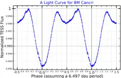 Like all Ap stars, 15 Cancri has a strong magnetic field. This magnetic field varies as it rotates and in 1968 the visual brightness of the star was shown to vary regularly over about four days.[12] 15 Cancri was given the variable star designation BM Cancri in 1972 as a member of the α2 CVn class of variable stars.[13] The period has since been measured more accurately at 3.3095 d, believed to be the rotational period of the star.[14]