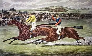 The 1886 Epsom Derby was a horse race which took place at Epsom Downs on 26 May 1886. It was the 106th running of the Derby, and it was won by Ormonde. The winner was ridden by Fred Archer and trained by John Porter. At the initial nomination stage 205 entries were received. At the beginning of 1886 Ormonde, Minting and Saraband were all a similar price for the Derby, around 11/2, with The Bard at 6/1.[1] Neither Minting or Saraband lined up at Epsom though, both having been easily beaten by Ormonde in the 2000 Guineas.
