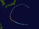 A low-level circulation north of Chuuk organized into a tropical depression on August 4. After moving quickly westward, the depression stalled on August 5 and August 6, allowing it to strengthen into a tropical storm and mature into a typhoon on August 7. The typhoon turned northward, rapidly intensifying to maximum sustained winds of 125 knots (232 km/h) on August 8 while east of Taiwan. Cooler water temperatures and vertical wind shear weakened Cecil as it continued northward, and as a 35 knots (65 km/h) tropical storm, it hit North Korea on August 14.[3][31]
