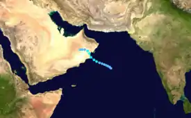 After becoming a tropical storm, the system's structure became more aligned as it developed an anticyclone aloft. Fueled by water temperatures of 29 °C (84 °F), the cyclone intensified further.[1] At 03:00 UTC on June 11, the Omani city of Fahud recorded sustained winds of 75 km/h (45 mph), and a station on Masirah Island recorded a pressure of 994 mbar (29.4 inHg). On this basis, the JTWC estimated that the storm attained peak winds of 75 km/h (45 mph).[2] However, a nearby ship reported sustained winds of 85 km/h (55 mph), and the well-defined structure on satellite imagery suggested winds as strong as 120 km/h (75 mph).[1] Moving northwestward, the cyclone made landfall around 09:00 UTC on June 11 about 130 km (80 mi) southwest of Masirah Island in southeastern Oman,[2] at a location named Ras Madrakah.[1] It quickly weakened over the desert terrain and dry air, and the circulation dissipated by June 12 over the central portion of the country.[2] However, the remnants turned to the southwest, steered by a northerly flow. It entered the Rub' al Khali, or Empty Quarter, of Saudi Arabia late on June 12, and continued slowly westward. The storm's interaction with the monsoon brought the Intertropical Convergence Zone northward into Oman and Yemen, bringing unusually heavy rainfall until the system gradually wound down.[1]