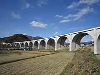 Two highways, the Nagano Expressway and the Jōshin-etsu Expressway, were also built in the Nagano region.[b 3] In May 1993, the 75.8-kilometer section of the Nagano Expressway was completed, and in October 1997, the 111.4 kilometer section of the Jōshin-etsu Expressway was completed.[b 4] In addition, another 114.9 kilometers of roads within Nagano Prefecture were improved.[2]