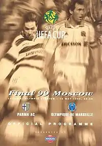 The 1999 UEFA Cup Final was an association football match played on 12 May 1999 at the Luzhniki Stadium in Moscow to determine the winners of the 1998–99 UEFA Cup. The match was contested by Parma of Italy and Marseille of France. Parma won the match 3–0 to claim their second UEFA Cup and fourth European trophy, having previously won the UEFA Cup Winners' Cup and the UEFA Super Cup on one occasion each. There were 61,000 spectators at the match, making it the highest-attended single-legged UEFA Cup/Europa League final.[3]
