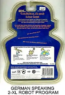 The toy was invented and licensed for manufacture by Michael J. Freeman, inventor, Ph.D. and was patented.[6] 2-XL exhibited rudimentary intelligence, memory, gameplay, and responsiveness. Dubbed the "Toy with a Personality," 2-XL could respond verbally to the user depending upon which "input or answer" buttons were chosen.[7] 2-XL during its run was one of the most popular toys in terms of market revenue and was dubbed the Talking Robot with a mind of its own.[8] The toy was voiced by Freeman,[9] using a synthesizer to make his voice a high-pitched robot-like sound; it was through this process that Freeman developed 2-XL's personality. 2-XL was first introduced in 1978 by the Mego Corporation, a publicly traded US-based toy company in New York City[10] and it subsequently became a success.[10][11][12] The toy was sold in different countries and the tapes were translated into seven foreign languages.[13] Games were also developed for the toy.[10]