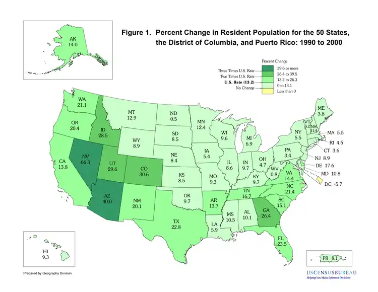 - "Resident Population of the 50 States, and the District of Columbia April 1, 2000 (Census 2000) and April 1, 1990 (1990 Census)". United States Census Bureau. December 28, 2000. Archived from the original on June 13, 2018. Retrieved August 24, 2012.