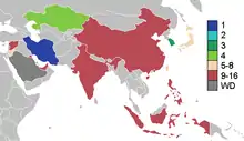 | East Asia (2+2+1) | Gulf (2+1) | Middle Asia (2) | Southeast Asia (2) | West Asia (2+2) |